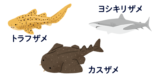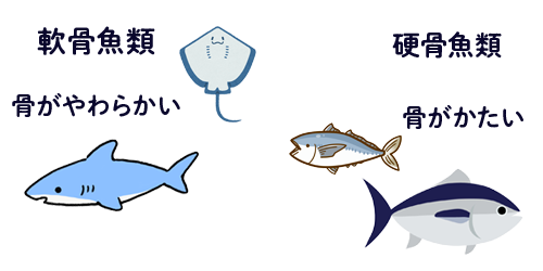 サメはエイと一緒の板鰓類(ばんさいるい)という軟骨魚類に分類されます。マグロやアジ、などほとんどの魚は硬骨魚類。その名の通り軟骨魚類の骨格は軟骨で、硬骨魚類では骨格のほとんどが硬骨であるという点が最も大きな違いです。