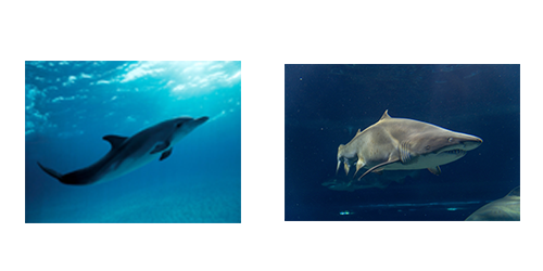 サメと、イルカ、姿がよく似ています。簡単な見分け方は、尾鰭の向き、サメは縦向きで、イルカは横向きです。これは泳ぎ方にも繋がります。サメは体を左右に動かします、イルカは、上下に体を動かします。